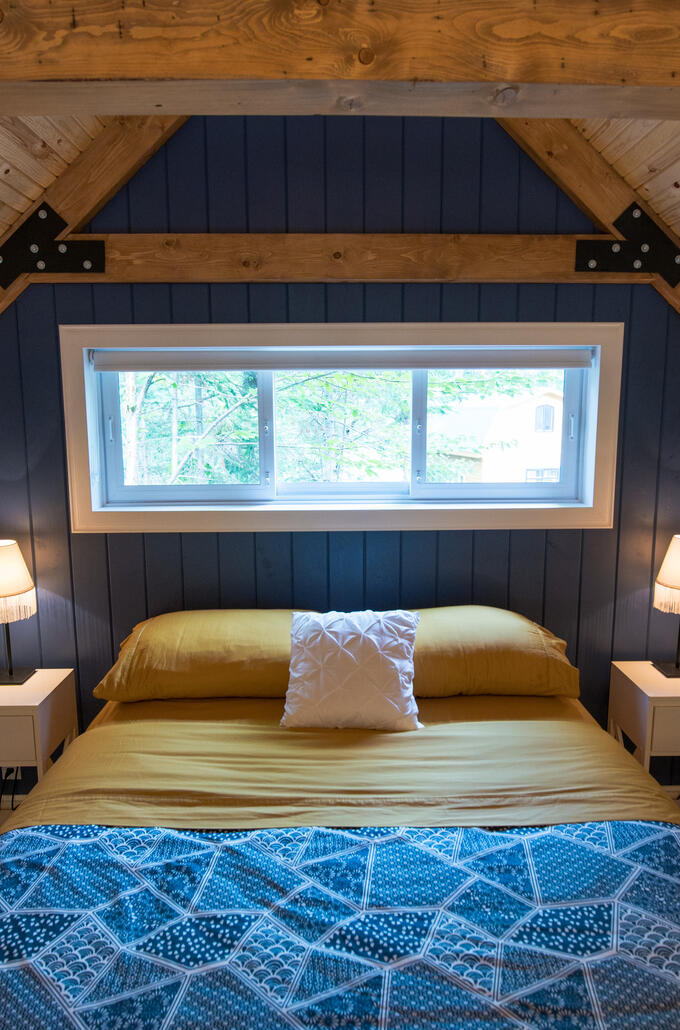 Charlevoix has a closely guarded secret: Saint-Siméon’s Quatrièmes Chutes. A secret that’s even more closely guarded: the next address, La Ptite Nature, a cute little rental cottage at the Cinquième Chute. Here, there are no cottages and no main building, just the warm and sincere welcome from your hosts, Sylvain and Sarah. Proud environmental advocates, and advocates of a simple, collaborative lifestyle, they built this charming hideaway of raspberry-coloured wood themselves, on their own lot, a stone’s throw from their house. Lovingly decorated with a wide variety of second-hand finds, items they’ve selected and enjoyed themselves, handmade objects, some they’ve crafted themselves, some made by friends, it's a colourful, warm cocoon with a small wood stove and all the comforts of a small house. From here, the sound of the waterfall rumbling below reaches our ears, and the scent of the forest wafts on the air. In short, we spend the kind of vacation time here we never want to see end. We’d stay for good if we could!