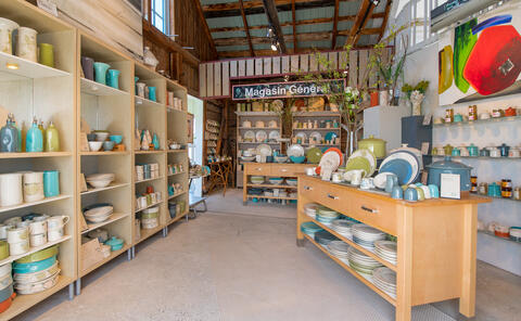 Creating throughout the winter in a world of hushed solitude where productive and organized manual work gives him a chance for renewal... Dealing with customers all summer, gratified by the sunny dispositions of vacationers travelling the length of the river road, and by the admiring looks they give his work… Stéphane finds peace of mind, balance, in a lifestyle that reflects his values, and those of this business, founded in 1985, whose philosophy continues to be modelled: Choose local, choose hand-crafted. Offer customers something different: offer something pretty, something durable, hand-made, made locally, by a craftsman from this place, a family man, someone active in his community, engaged in advocating for this area. Pieces of art that occupy a functional place in daily life are an extension and affirmation of convictions rooted in this soil, majestically overlooking the St. Lawrence River. Taking the notion we have of Charlevoix as a foodie paradise even further: taste Charlevoix on a hand-made plate created right here. This is the vision that brings about exceptional partnerships, in particular, the creation of custom dinnerware for the celebrated and contemporary Les Faux-Bergers à Baie-Saint-Paul restaurant.
