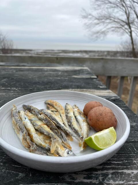 Connaissez-vous le capelan? C’est un petit éperlan local qui roule abondamment sur nos grèves et nos plages au printemps. Une ressource alimentaire marine qu’il suffit de ramasser comme une véritable pêche miraculeuse. Auparavant nos grand-pères partaient avec leurs sceaux et filets et c’est sans compter toutes les pêches à la fascine qui se dressaient alors ça et là dans le paysage. Manger du capelan au printemps est encore un incontournable ici dans Charlevoix. Ces petits poissons se font tout simplement frire une fois farinés, dans le beurre à la poêle et ils sont un vrai régal, surtout si on a la chance d’avoir dans notre assiette de nombreuses mères, le ventre rempli de leur délicieux sacs d’oeufs.