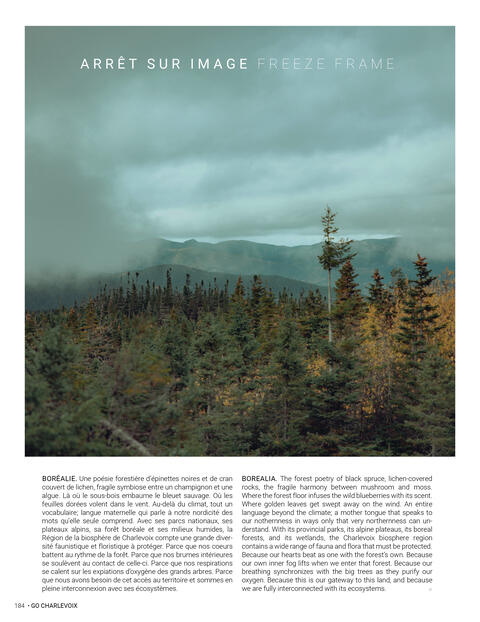 La dernière page (qu'on nomme joliment "Arrêt sur image") de l'édition 2025 de notre magazine imprimé, nous l'avons offerte à la nature boréale du territoire forestier de Charlevoix. Découvrez ici pourquoi cette boréalie nous empoétise et touche notre âme profondément...